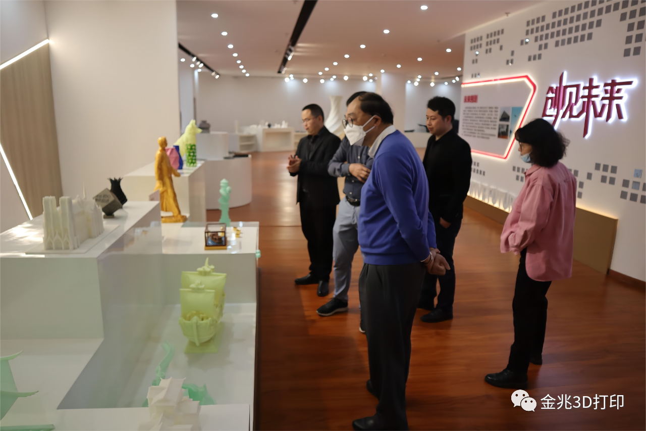 黄乃正院士一行在钟总、孙博和程博的陪同下先参观了金兆智能3D打印成品陈列展厅。金兆智能总经理钟再生向黄乃正院士一行介绍了金兆智能的发展历程,所获荣誉等,并展示解说了不同材料所打印的3D打印成品的优势以及所涉及的领域。